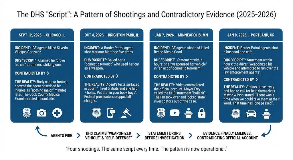 Four shootings now follow the same script. Agents fire. DHS claims “weaponized vehicle.” The statement drops before any investigation. Evidence eventually contradicts the official account. No one is held accountable. The operation continues.